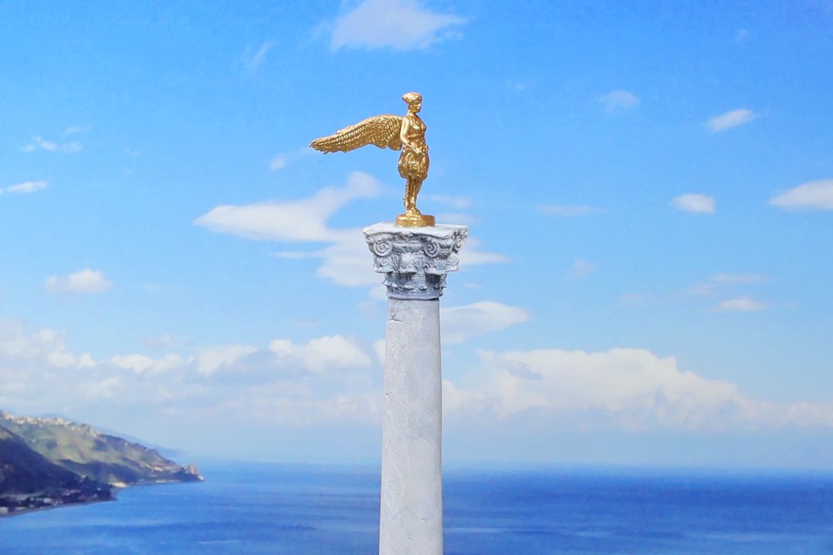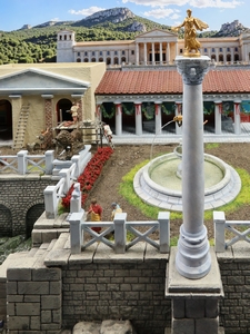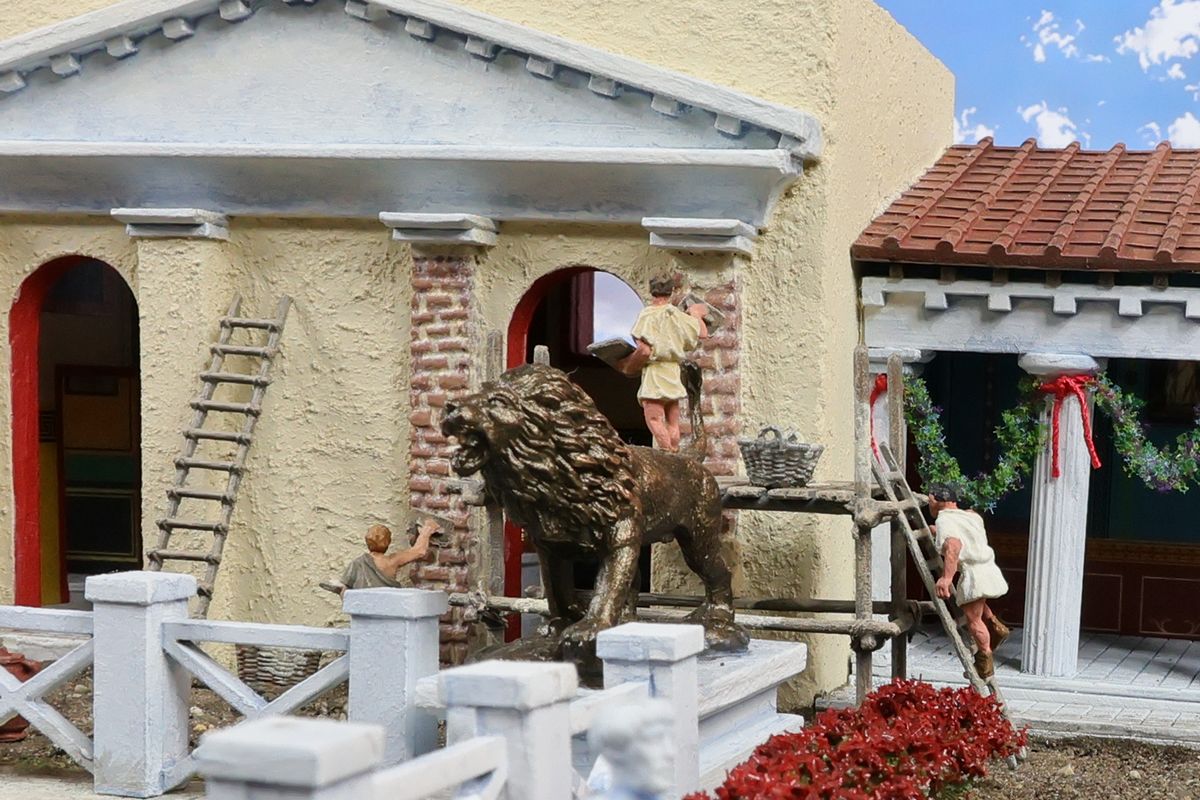 DIE KAISERLICHE VILLA Herzstück dieses Dioramas ist der Vestatempel von Imperial-Modellbau, der hier allerdings nicht auf das Forum Roman gestellt wurde, sondern als Tempel im Garten einer kaiserlichen Villa dient. Die gezeigte Anlage orientiert sich an realen Vorbildern, ist in ihrer konkreten Gestaltung aber vollkommen fiktiv. Doch da nun einmal jedes Kind einen Namen braucht, musste für die Verortung Domitians Villa in Circeii herhalten – und die ist ohnehin so schlecht erhalten, dass sie ausreichend Raum für phantasievolle Rekonstruktionen lässt. Domitian selbst wird durch die Vespasian-Figur aus dem Triumphset von Alex/Cremerius dargestellt. Sicher eine der charaktervollsten Figuren in der gesamten 1/72-Welt: Mit ihrem arroganten Gesichtsausdruck ist sie zur Personifikation Domitians mindestens genauso gut geeignet wie für seinen Vater. |