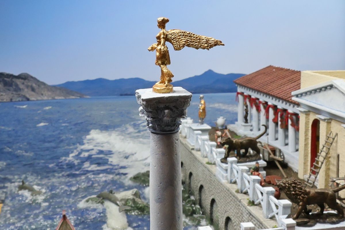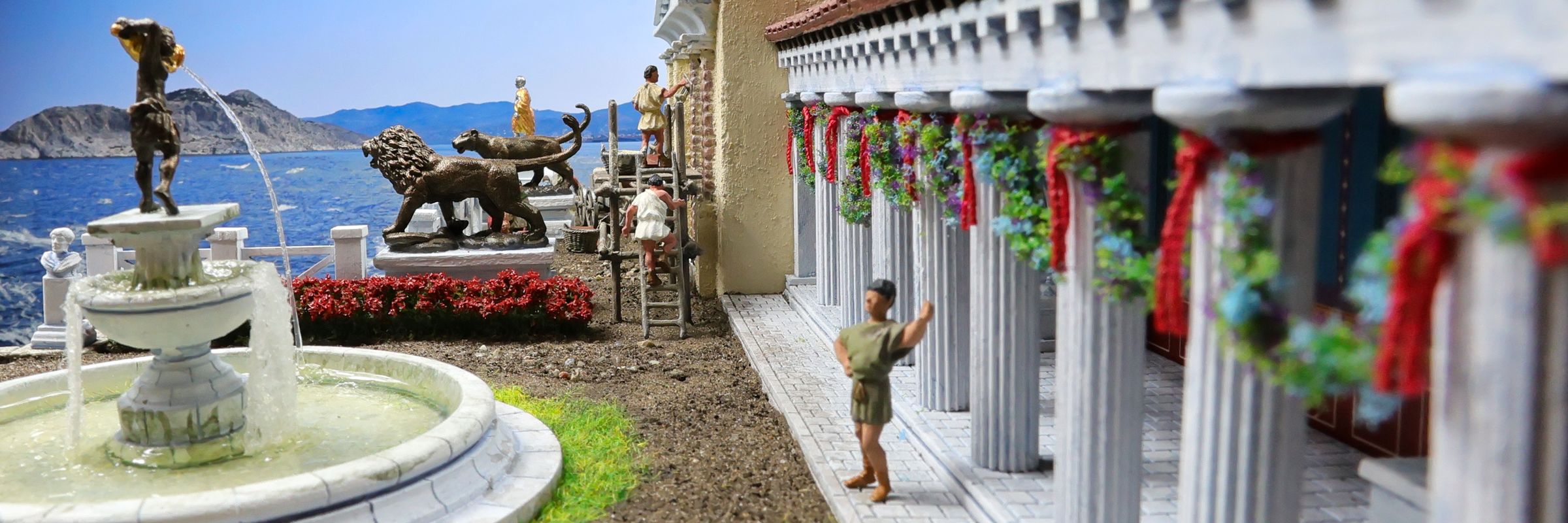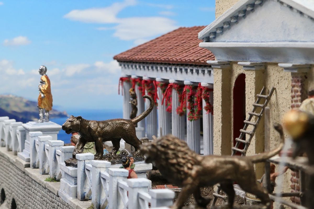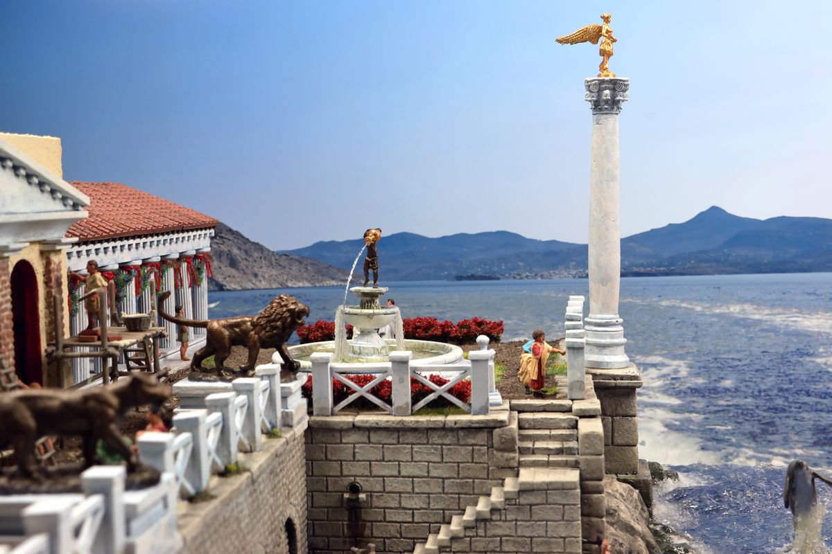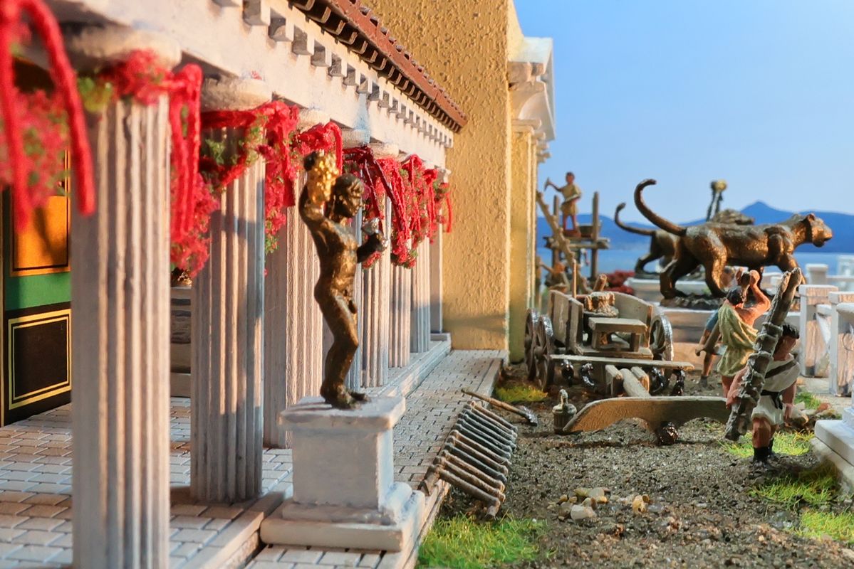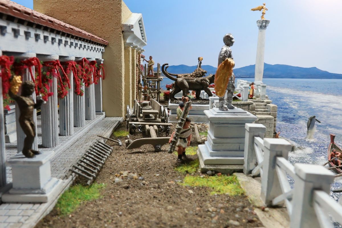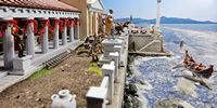 EINE VILLA AM MEER Dieses Diorama zeigt die Wasserseite einer römischen villa maritima. Der Hauptanstoß kam von Plinius dem Jüngeren, der in seinen Briefen über seine Villen in Italien schrieb. Tatsächlich präsentiert er literarische Texte, die keine präzisen Baupläne beschreiben: Es ist unmöglich, anhand der Plinius-Briefe eine exakte Rekonstruktion eines seiner Anwesen anzufertigen. Das hielt die Leute jedoch nicht von Spekulationen ab: Mein Lieblingsentwurf ist der von Karl Friedrich Schinkel aus dem Jahr 1840, welcher Plinius’ Villa Laurentinum an der Laurentinischen Küste südlich von Rom darstellt. (Eine Abbildung davon gibt es hier.) Schinkels Rekonstruktion ist reine Architekturfantasie, aber dennoch sehr beeindruckend! Und eine schöne Inspiration, obwohl aus Platzgründen nur ein kleiner Ausschnitt eines solchen Anwesens gezeigt werden kann. Die Grundfläche des Dioramas ist 58 Zentimeter breit (entspricht in der Wirklichkeit etwa 42 Meter); für eine vollständige Anlage wie in Schinkels Rekonstruktion bräuchte man eine Fläche von mindestens 2 × 2 Metern. Die Hintergrundfotos zeigen zum einen mediterrane Küsten (© S. Berry; © George E. Koronaios / CC BY-SA 4.0), zum anderen eine durch KI erzeugte Fortsetzung römischer Villengebäude in einer Berglandschaft, um einen passenden Anschluss für das Hinterland des Dioramas zu erzeugen. Dieses Experiment mit KI-generierten Bildern (PromeAI) ist ganz nett ausgefallen, allerdings nicht perfekt – ein Fehler in der Orientierung der Dachziegel ist besonders auffällig, wurde aber "zu Dokumentationszwecken" bewusst belassen. Hier noch einige Bilder im Panoramaformat: |