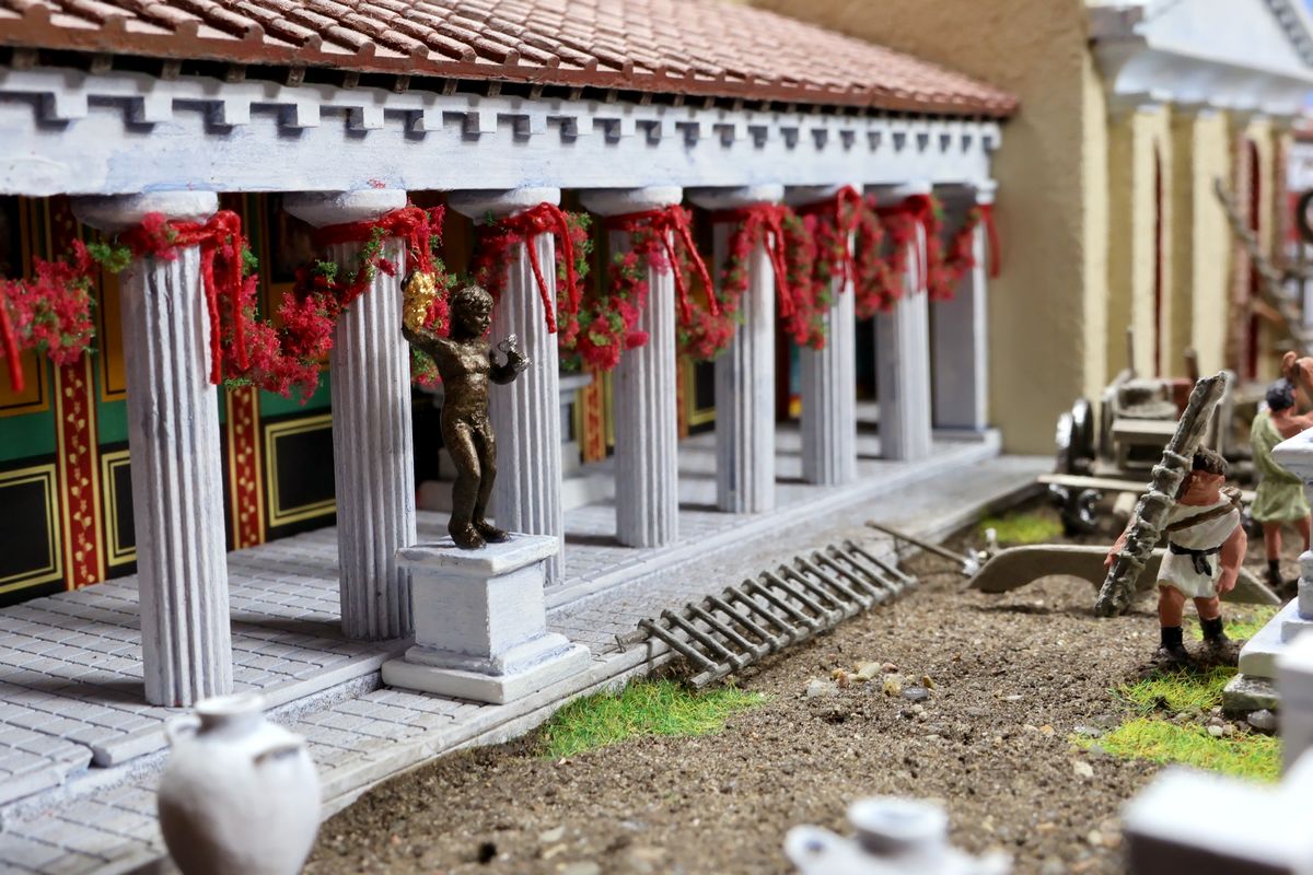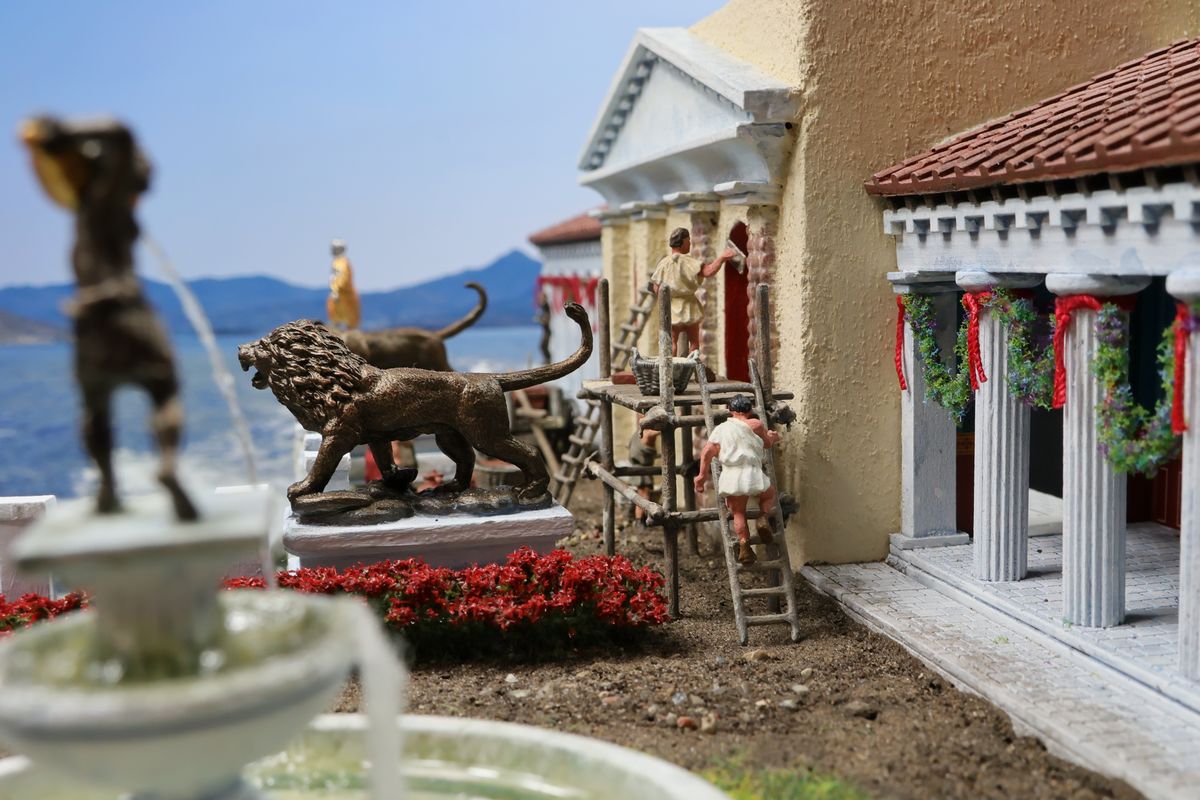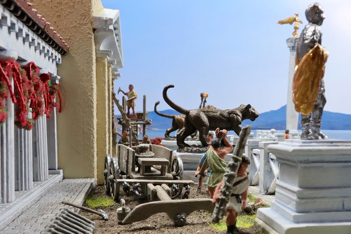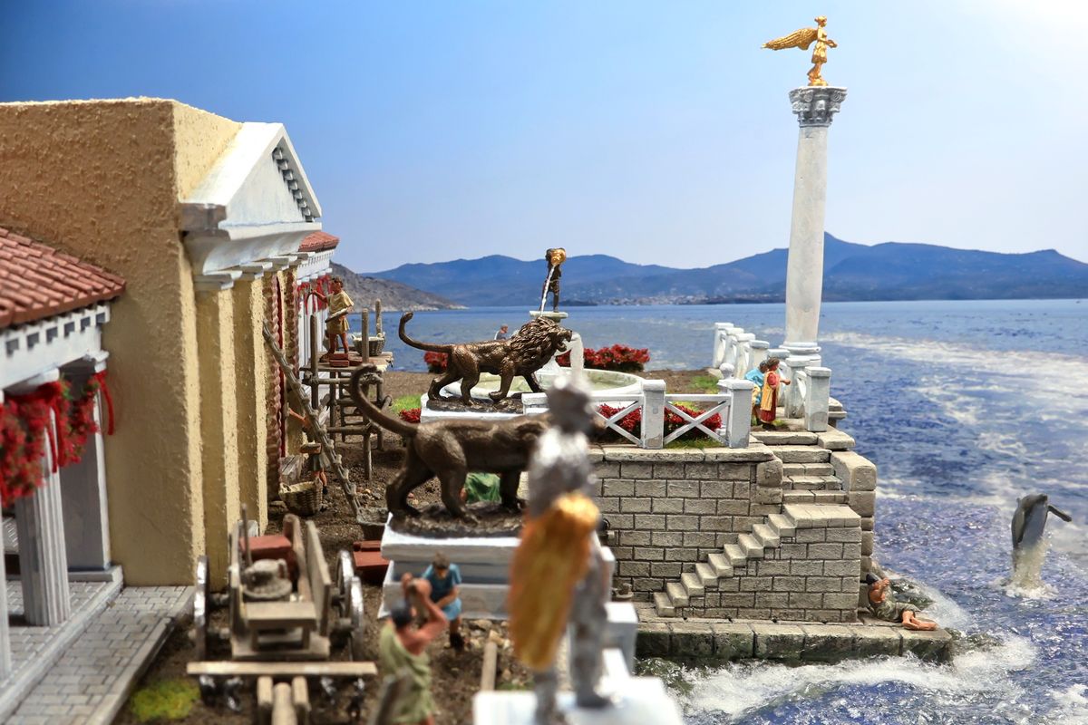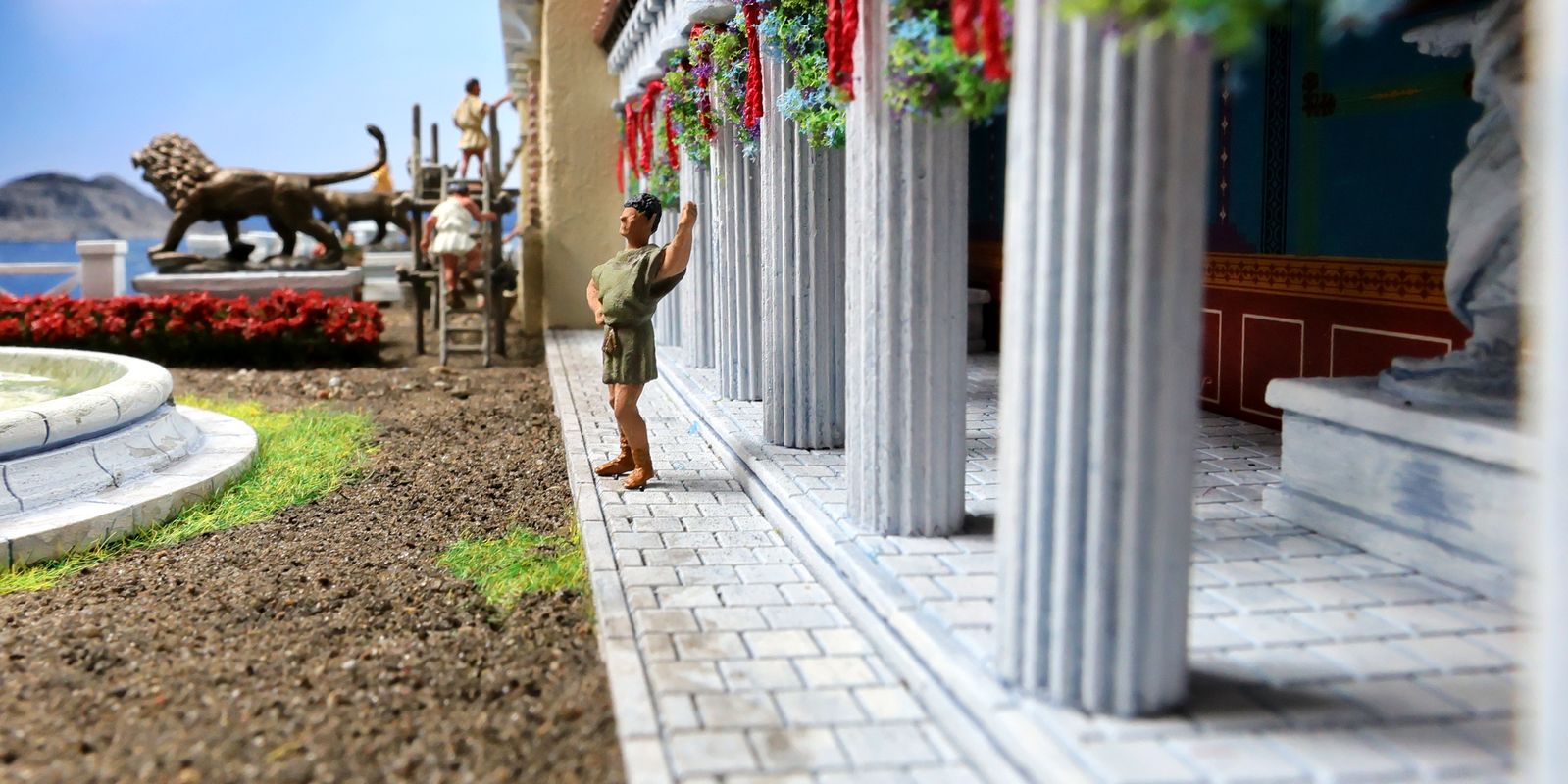 EINE VILLA AM MEER Dieses Diorama zeigt die Wasserseite einer römischen villa maritima. Der Hauptanstoß kam von Plinius dem Jüngeren, der in seinen Briefen über seine Villen in Italien schrieb. Tatsächlich präsentiert er literarische Texte, die keine präzisen Baupläne beschreiben: Es ist unmöglich, anhand der Plinius-Briefe eine exakte Rekonstruktion eines seiner Anwesen anzufertigen. Das hielt die Leute jedoch nicht von Spekulationen ab: Mein Lieblingsentwurf ist der von Karl Friedrich Schinkel aus dem Jahr 1840, welcher Plinius’ Villa Laurentinum an der Laurentinischen Küste südlich von Rom darstellt. (Eine Abbildung davon gibt es hier.) Schinkels Rekonstruktion ist reine Architekturfantasie, aber dennoch sehr beeindruckend! Und eine schöne Inspiration, obwohl aus Platzgründen nur ein kleiner Ausschnitt eines solchen Anwesens gezeigt werden kann. Die Grundfläche des Dioramas ist 58 Zentimeter breit (entspricht in der Wirklichkeit etwa 42 Meter); für eine vollständige Anlage wie in Schinkels Rekonstruktion bräuchte man eine Fläche von mindestens 2 × 2 Metern. Die Hintergrundfotos zeigen zum einen mediterrane Küsten (© S. Berry; © George E. Koronaios / CC BY-SA 4.0), zum anderen eine durch KI erzeugte Fortsetzung römischer Villengebäude in einer Berglandschaft, um einen passenden Anschluss für das Hinterland des Dioramas zu erzeugen. Dieses Experiment mit KI-generierten Bildern (PromeAI) ist ganz nett ausgefallen, allerdings nicht perfekt – ein Fehler in der Orientierung der Dachziegel ist besonders auffällig, wurde aber "zu Dokumentationszwecken" bewusst belassen. Hier noch einige Bilder im Panoramaformat: |