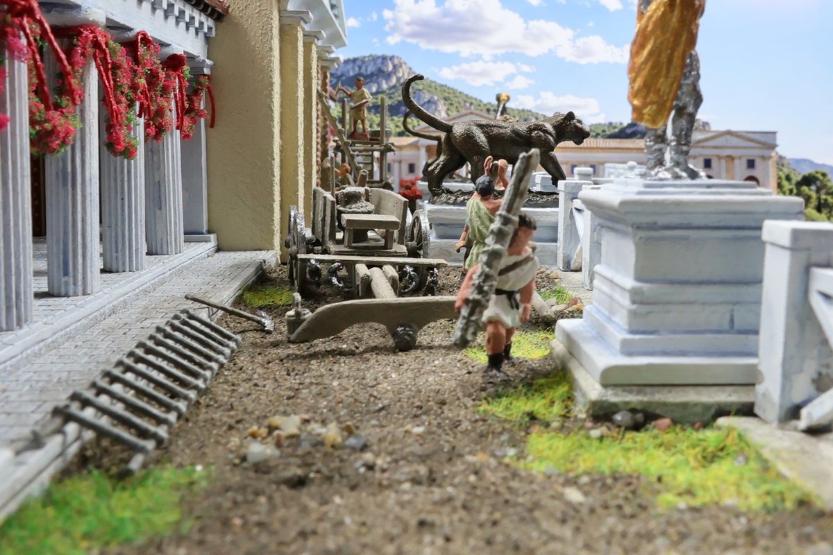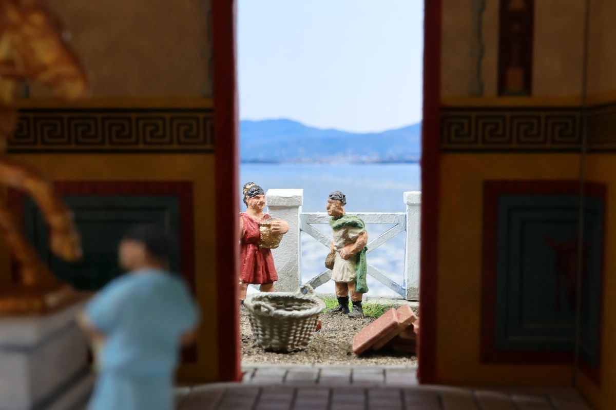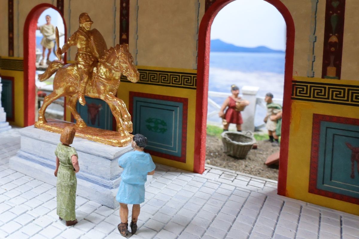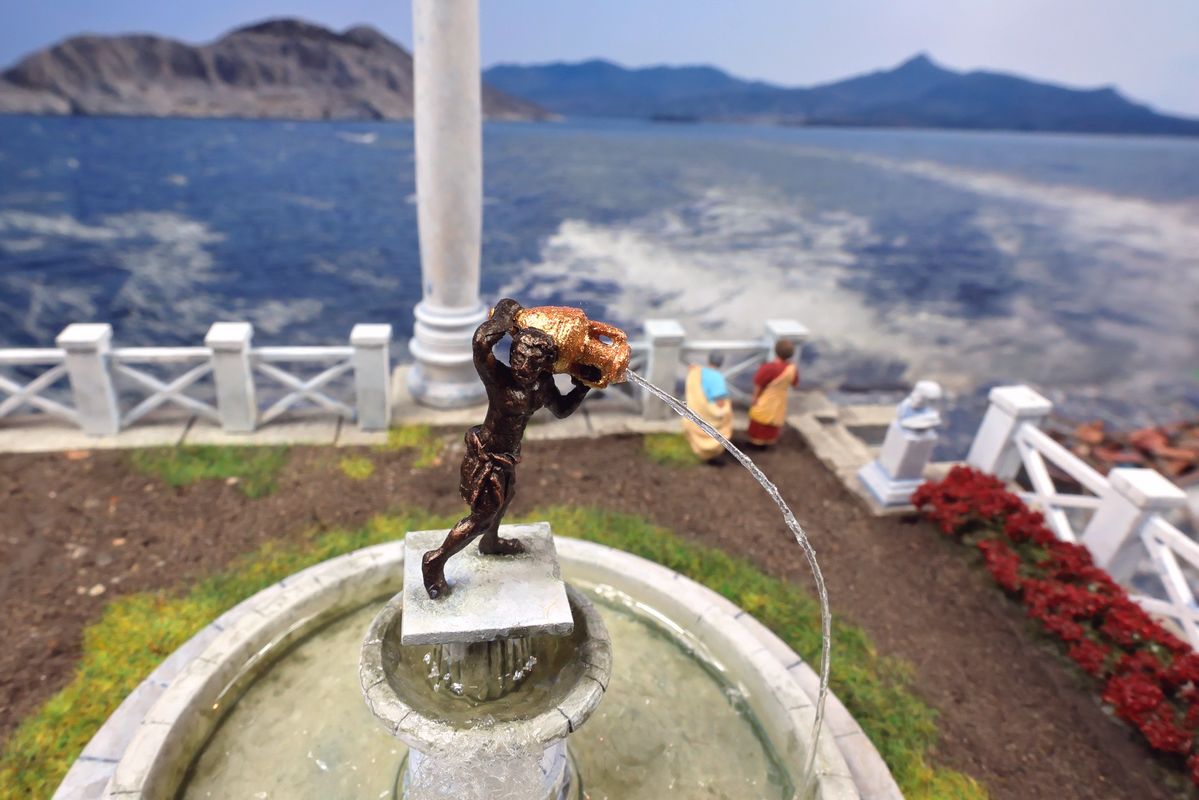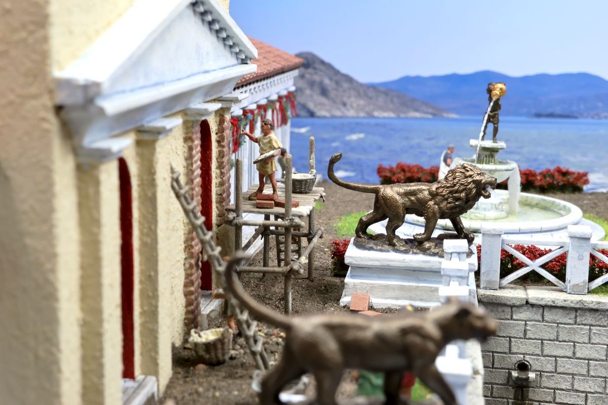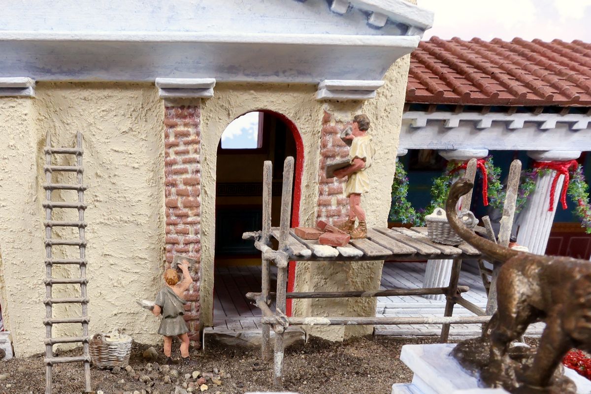EINE VILLA AM MEER Dieses Diorama zeigt die Wasserseite einer römischen villa maritima. Der Hauptanstoß kam von Plinius dem Jüngeren, der in seinen Briefen über seine Villen in Italien schrieb. Tatsächlich präsentiert er literarische Texte, die keine präzisen Baupläne beschreiben: Es ist unmöglich, anhand der Plinius-Briefe eine exakte Rekonstruktion eines seiner Anwesen anzufertigen. Das hielt die Leute jedoch nicht von Spekulationen ab: Mein Lieblingsentwurf ist der von Karl Friedrich Schinkel aus dem Jahr 1840, welcher Plinius’ Villa Laurentinum an der Laurentinischen Küste südlich von Rom darstellt. (Eine Abbildung davon gibt es hier.) Schinkels Rekonstruktion ist reine Architekturfantasie, aber dennoch sehr beeindruckend! Und eine schöne Inspiration, obwohl aus Platzgründen nur ein kleiner Ausschnitt eines solchen Anwesens gezeigt werden kann. Die Grundfläche des Dioramas ist 58 Zentimeter breit (entspricht in der Wirklichkeit etwa 42 Meter); für eine vollständige Anlage wie in Schinkels Rekonstruktion bräuchte man eine Fläche von mindestens 2 × 2 Metern. Die Hintergrundfotos zeigen zum einen mediterrane Küsten (© S. Berry; © George E. Koronaios / CC BY-SA 4.0), zum anderen eine durch KI erzeugte Fortsetzung römischer Villengebäude in einer Berglandschaft, um einen passenden Anschluss für das Hinterland des Dioramas zu erzeugen. Dieses Experiment mit KI-generierten Bildern (PromeAI) ist ganz nett ausgefallen, allerdings nicht perfekt – ein Fehler in der Orientierung der Dachziegel ist besonders auffällig, wurde aber "zu Dokumentationszwecken" bewusst belassen. Hier noch einige Bilder im Panoramaformat: |