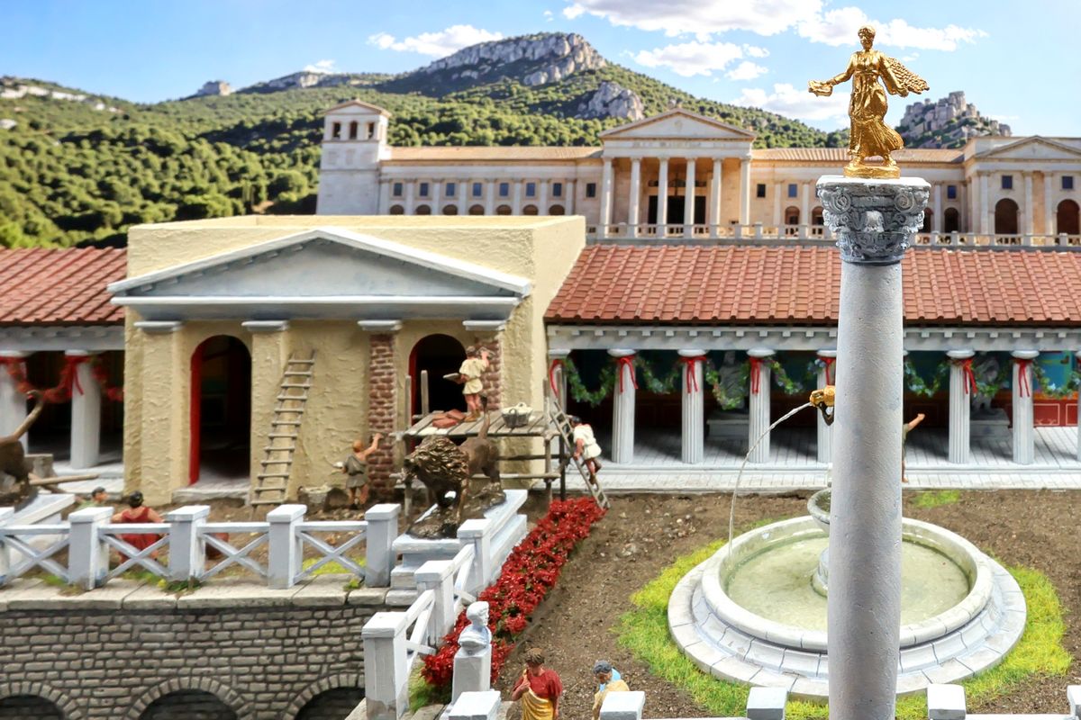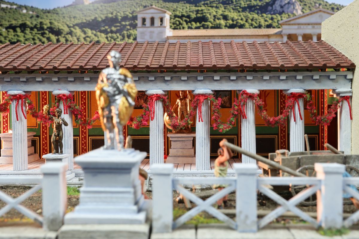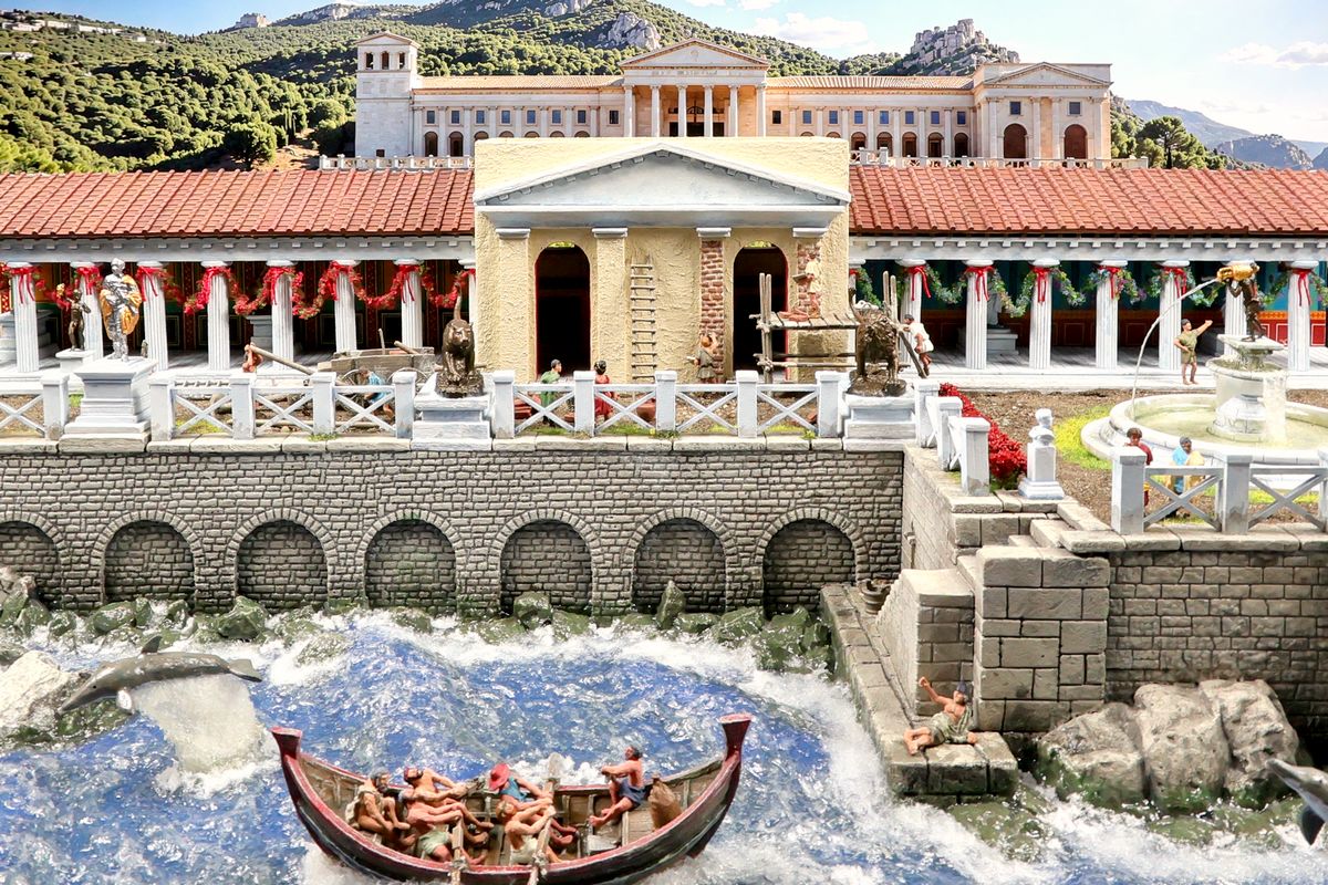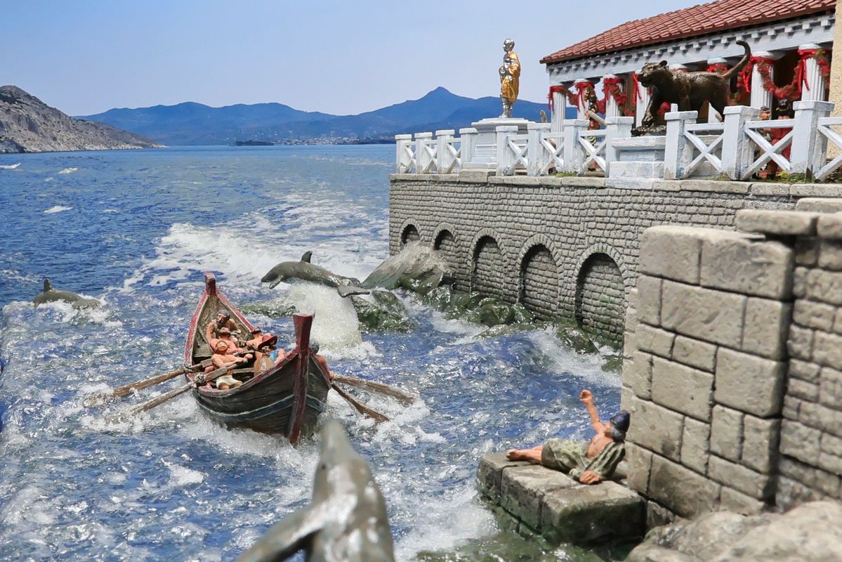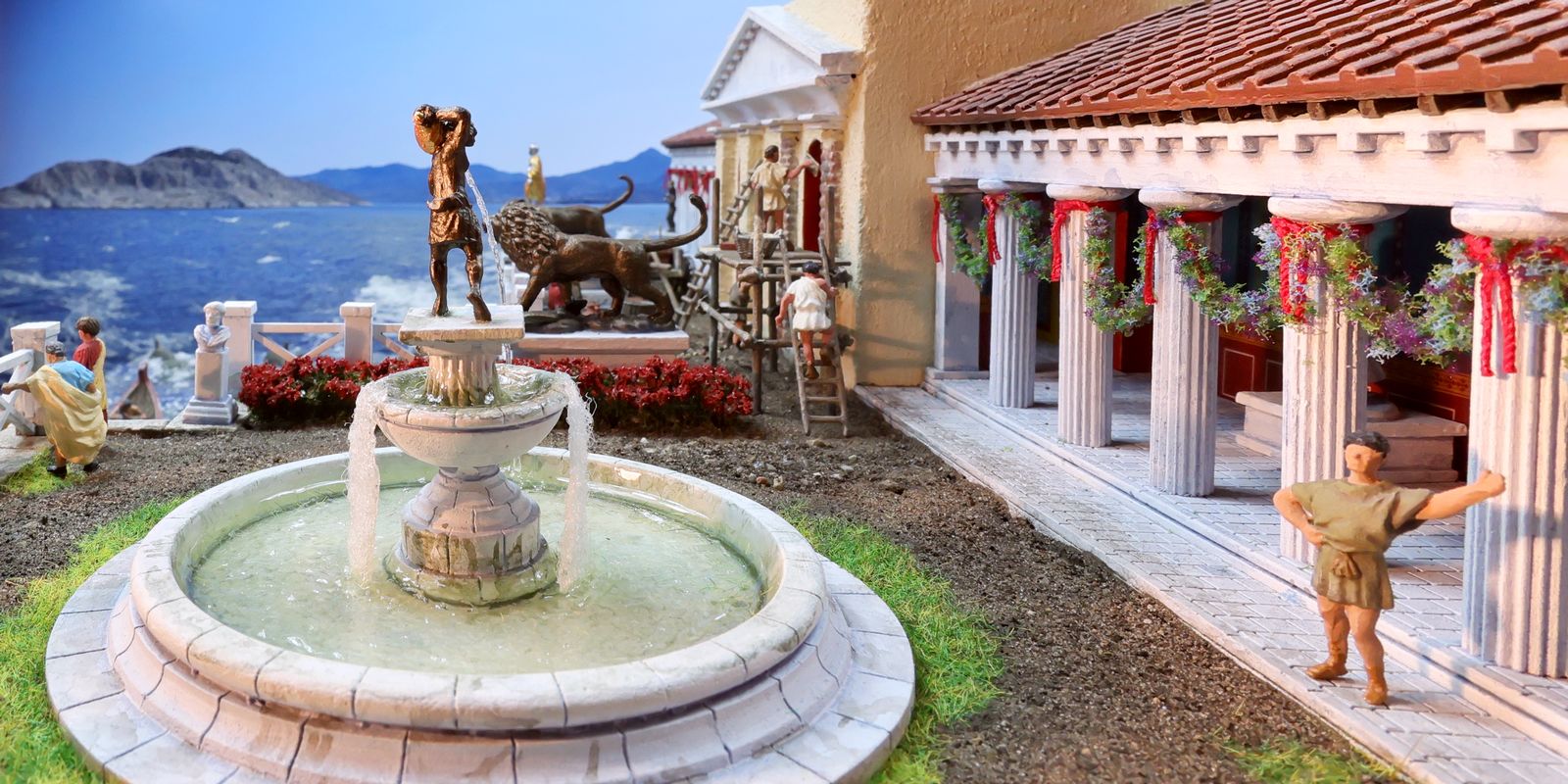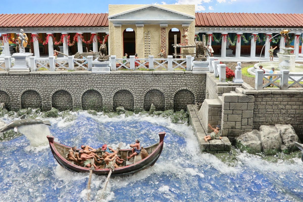 EINE VILLA AM MEER Dieses Diorama zeigt die Wasserseite einer römischen villa maritima. Der Hauptanstoß kam von Plinius dem Jüngeren, der in seinen Briefen über seine Villen in Italien schrieb. Tatsächlich präsentiert er literarische Texte, die keine präzisen Baupläne beschreiben: Es ist unmöglich, anhand der Plinius-Briefe eine exakte Rekonstruktion eines seiner Anwesen anzufertigen. Das hielt die Leute jedoch nicht von Spekulationen ab: Mein Lieblingsentwurf ist der von Karl Friedrich Schinkel aus dem Jahr 1840, welcher Plinius’ Villa Laurentinum an der Laurentinischen Küste südlich von Rom darstellt. (Eine Abbildung davon gibt es hier.) Schinkels Rekonstruktion ist reine Architekturfantasie, aber dennoch sehr beeindruckend! Und eine schöne Inspiration, obwohl aus Platzgründen nur ein kleiner Ausschnitt eines solchen Anwesens gezeigt werden kann. Die Grundfläche des Dioramas ist 58 Zentimeter breit (entspricht in der Wirklichkeit etwa 42 Meter); für eine vollständige Anlage wie in Schinkels Rekonstruktion bräuchte man eine Fläche von mindestens 2 × 2 Metern. Die Hintergrundfotos zeigen zum einen mediterrane Küsten (© S. Berry; © George E. Koronaios / CC BY-SA 4.0), zum anderen eine durch KI erzeugte Fortsetzung römischer Villengebäude in einer Berglandschaft, um einen passenden Anschluss für das Hinterland des Dioramas zu erzeugen. Dieses Experiment mit KI-generierten Bildern (PromeAI) ist ganz nett ausgefallen, allerdings nicht perfekt – ein Fehler in der Orientierung der Dachziegel ist besonders auffällig, wurde aber "zu Dokumentationszwecken" bewusst belassen. Hier noch einige Bilder im Panoramaformat: |