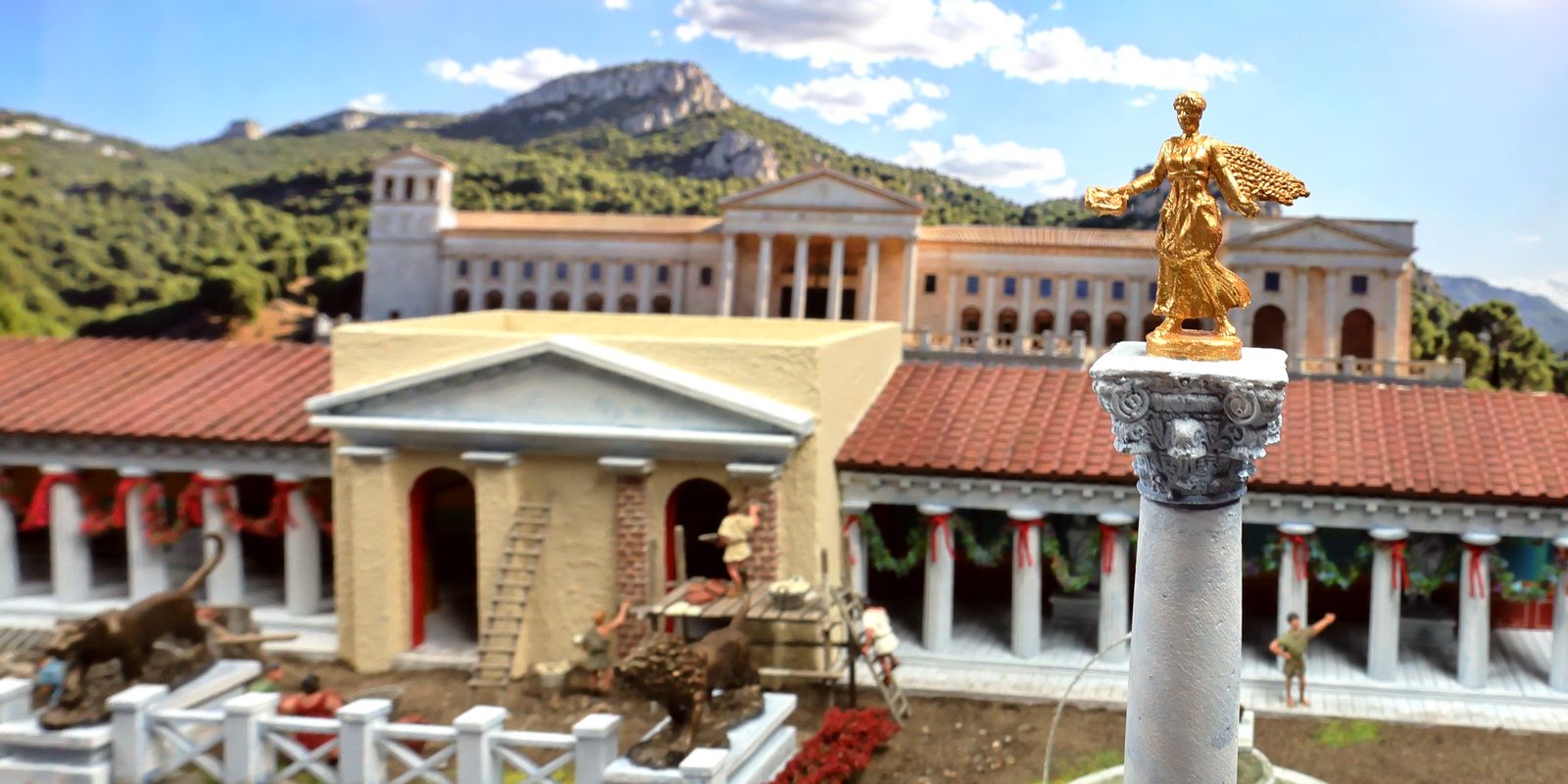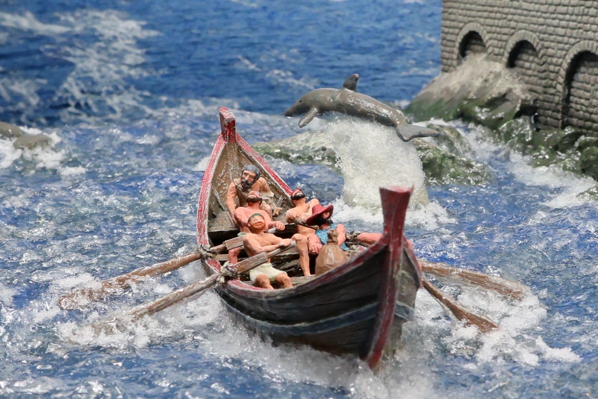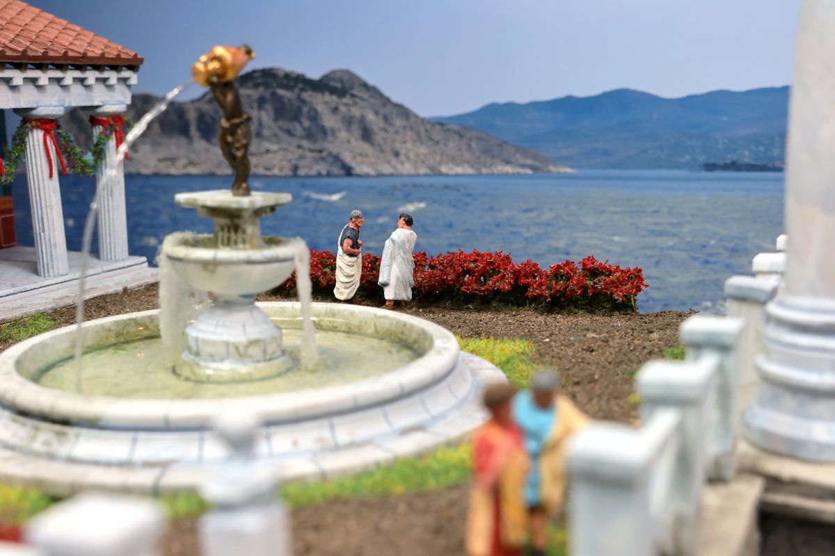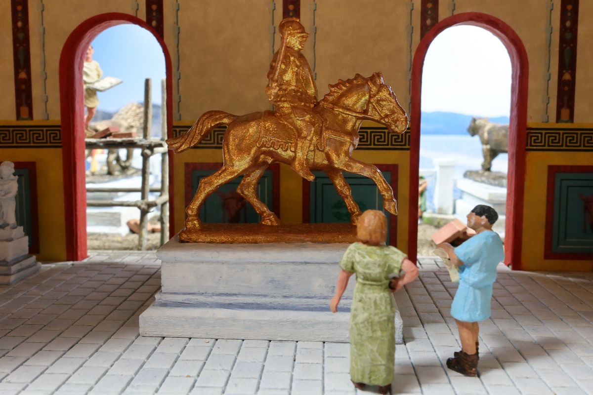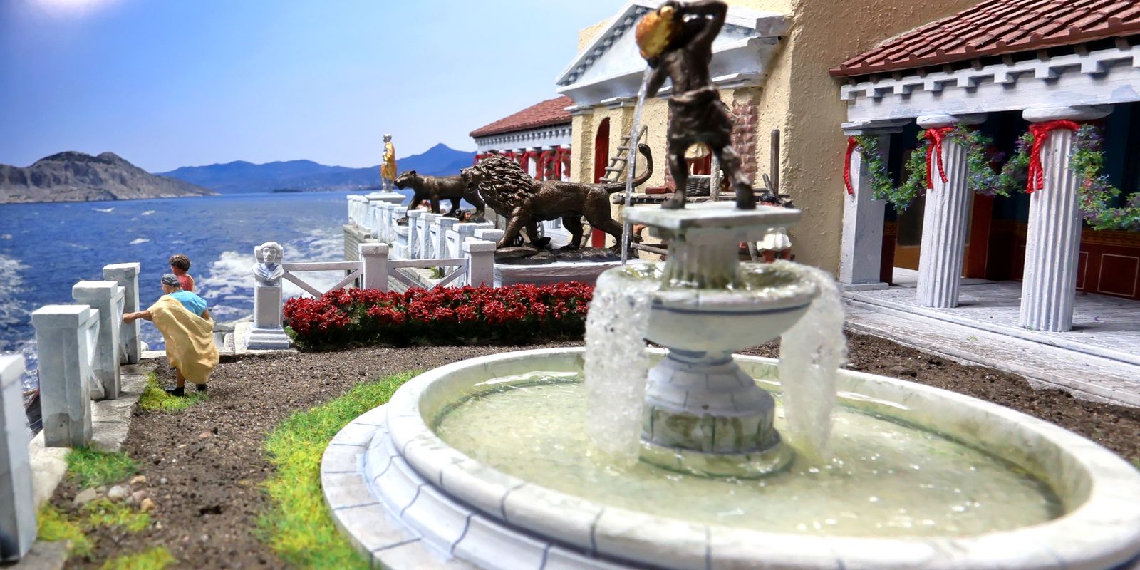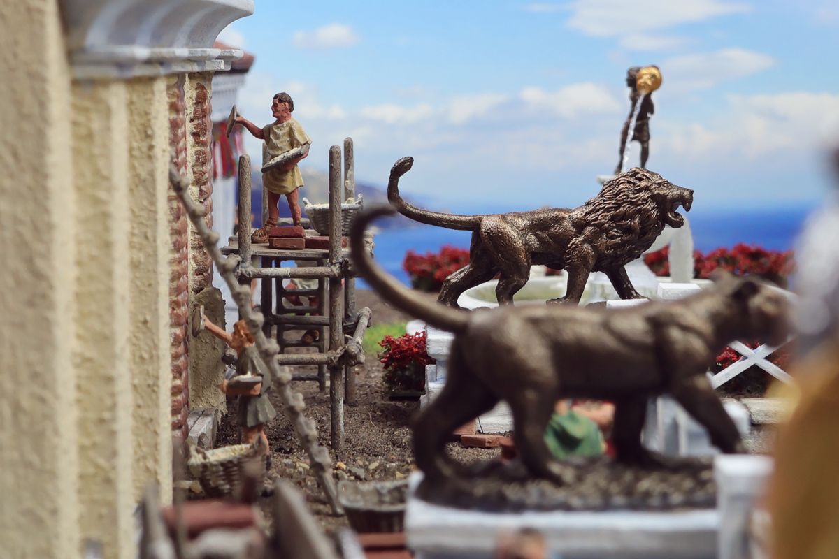 EINE VILLA AM MEER Dieses Diorama zeigt die Wasserseite einer römischen villa maritima. Der Hauptanstoß kam von Plinius dem Jüngeren, der in seinen Briefen über seine Villen in Italien schrieb. Tatsächlich präsentiert er literarische Texte, die keine präzisen Baupläne beschreiben: Es ist unmöglich, anhand der Plinius-Briefe eine exakte Rekonstruktion eines seiner Anwesen anzufertigen. Das hielt die Leute jedoch nicht von Spekulationen ab: Mein Lieblingsentwurf ist der von Karl Friedrich Schinkel aus dem Jahr 1840, welcher Plinius’ Villa Laurentinum an der Laurentinischen Küste südlich von Rom darstellt. (Eine Abbildung davon gibt es hier.) Schinkels Rekonstruktion ist reine Architekturfantasie, aber dennoch sehr beeindruckend! Und eine schöne Inspiration, obwohl aus Platzgründen nur ein kleiner Ausschnitt eines solchen Anwesens gezeigt werden kann. Die Grundfläche des Dioramas ist 58 Zentimeter breit (entspricht in der Wirklichkeit etwa 42 Meter); für eine vollständige Anlage wie in Schinkels Rekonstruktion bräuchte man eine Fläche von mindestens 2 × 2 Metern. Die Hintergrundfotos zeigen zum einen mediterrane Küsten (© S. Berry; © George E. Koronaios / CC BY-SA 4.0), zum anderen eine durch KI erzeugte Fortsetzung römischer Villengebäude in einer Berglandschaft, um einen passenden Anschluss für das Hinterland des Dioramas zu erzeugen. Dieses Experiment mit KI-generierten Bildern (PromeAI) ist ganz nett ausgefallen, allerdings nicht perfekt – ein Fehler in der Orientierung der Dachziegel ist besonders auffällig, wurde aber "zu Dokumentationszwecken" bewusst belassen. Hier noch einige Bilder im Panoramaformat: |