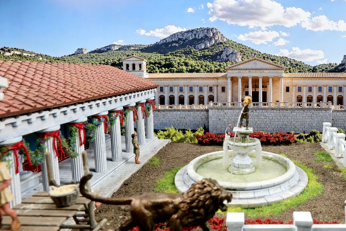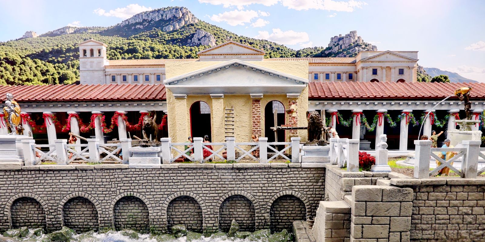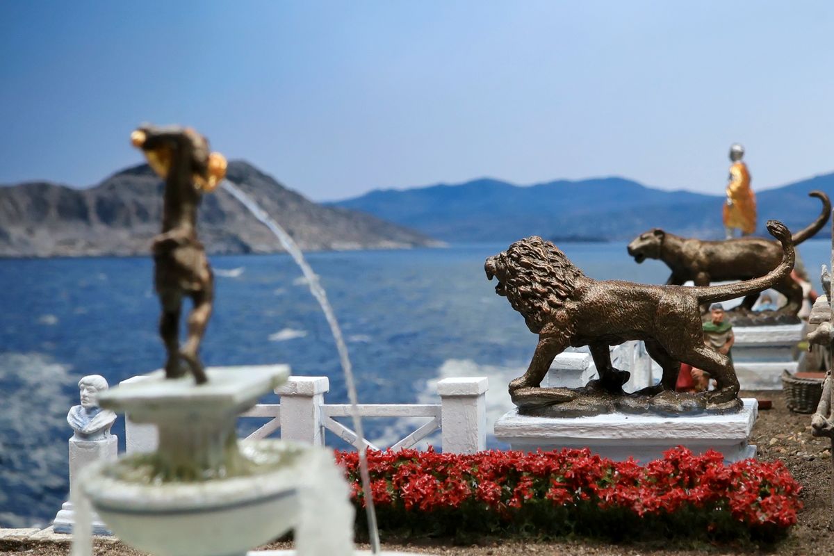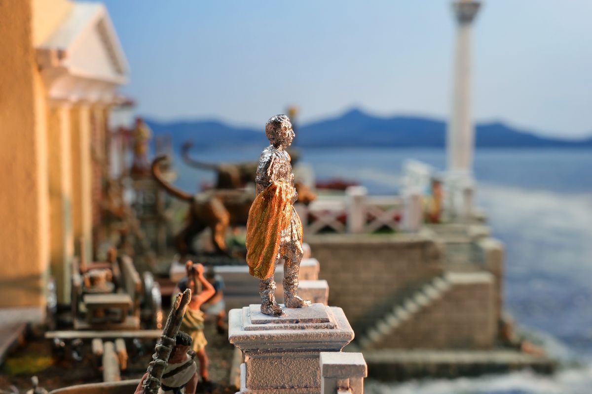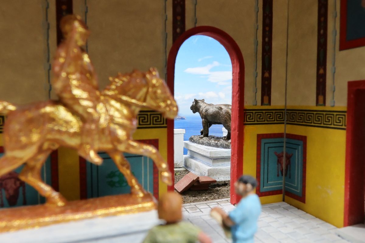 EINE VILLA AM MEER Dieses Diorama zeigt die Wasserseite einer römischen villa maritima. Der Hauptanstoß kam von Plinius dem Jüngeren, der in seinen Briefen über seine Villen in Italien schrieb. Tatsächlich präsentiert er literarische Texte, die keine präzisen Baupläne beschreiben: Es ist unmöglich, anhand der Plinius-Briefe eine exakte Rekonstruktion eines seiner Anwesen anzufertigen. Das hielt die Leute jedoch nicht von Spekulationen ab: Mein Lieblingsentwurf ist der von Karl Friedrich Schinkel aus dem Jahr 1840, welcher Plinius’ Villa Laurentinum an der Laurentinischen Küste südlich von Rom darstellt. (Eine Abbildung davon gibt es hier.) Schinkels Rekonstruktion ist reine Architekturfantasie, aber dennoch sehr beeindruckend! Und eine schöne Inspiration, obwohl aus Platzgründen nur ein kleiner Ausschnitt eines solchen Anwesens gezeigt werden kann. Die Grundfläche des Dioramas ist 58 Zentimeter breit (entspricht in der Wirklichkeit etwa 42 Meter); für eine vollständige Anlage wie in Schinkels Rekonstruktion bräuchte man eine Fläche von mindestens 2 × 2 Metern. Die Hintergrundfotos zeigen zum einen mediterrane Küsten (© S. Berry; © George E. Koronaios / CC BY-SA 4.0), zum anderen eine durch KI erzeugte Fortsetzung römischer Villengebäude in einer Berglandschaft, um einen passenden Anschluss für das Hinterland des Dioramas zu erzeugen. Dieses Experiment mit KI-generierten Bildern (PromeAI) ist ganz nett ausgefallen, allerdings nicht perfekt – ein Fehler in der Orientierung der Dachziegel ist besonders auffällig, wurde aber "zu Dokumentationszwecken" bewusst belassen. Hier noch einige Bilder im Panoramaformat: |