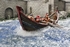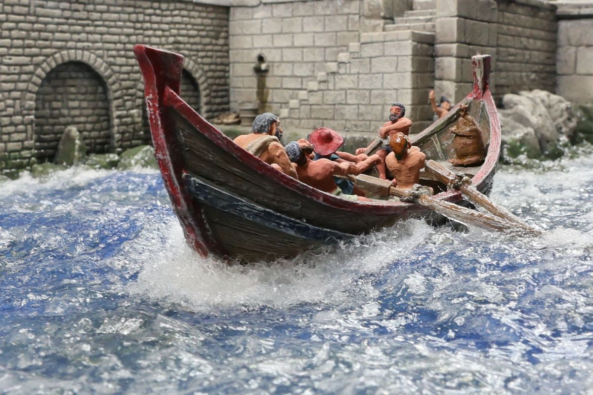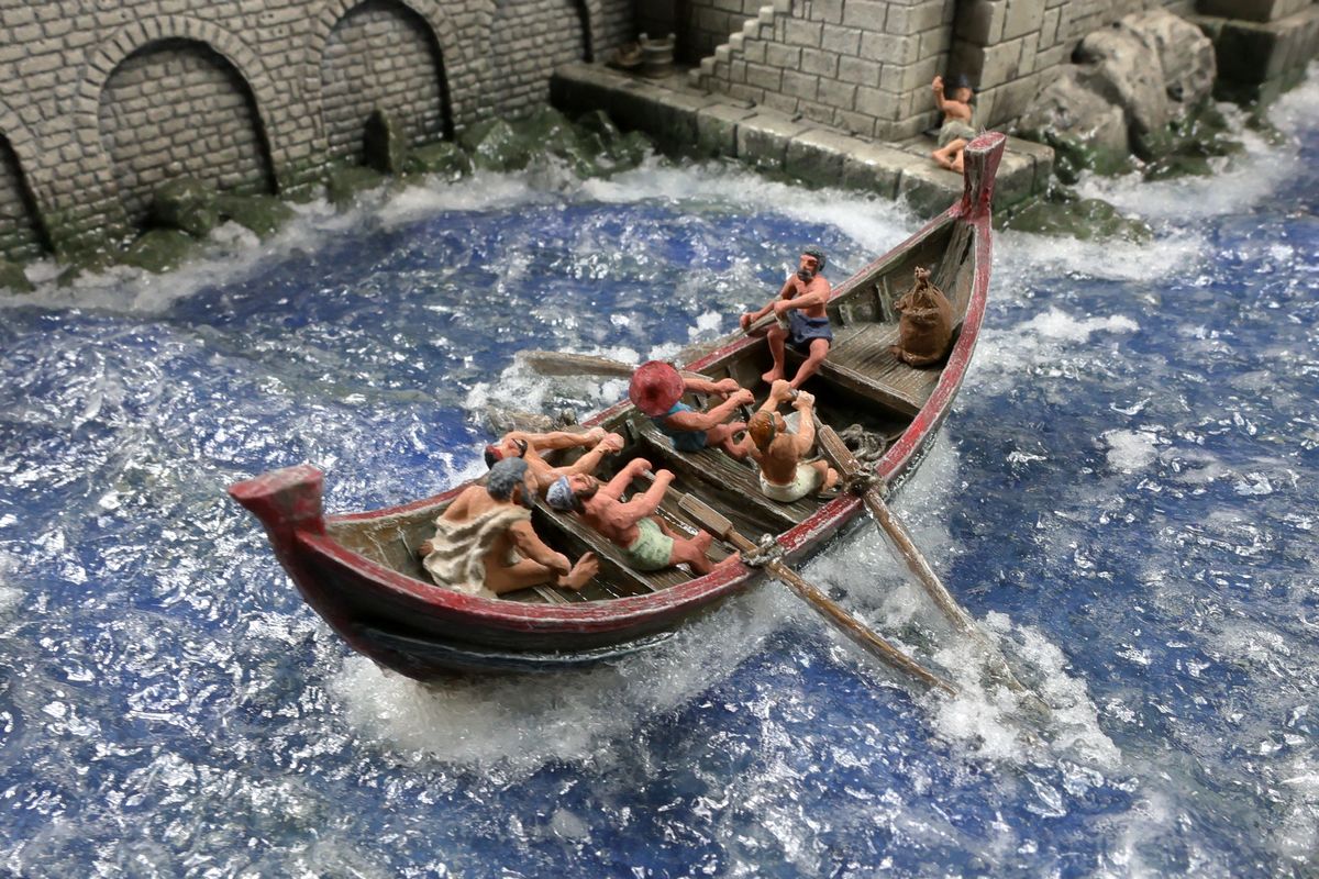 RÖMISCHER HAFEN MIT HANDELSSCHIFF Der Flusshafen an einem Rheinarm hat die römische Colonia Ulpia Traiana, das heutige Xanten, als Vorbild. Das Schiff in dieser Szene wäre eigentlich zu groß für diesen Hafen, typisch waren in dieser Region damals deutlich kleinere Frachter und prahmartige, flache Kähne. Aber das phantastische römische Handelsschiff in Resin (aus dem Programm von Fuhrmann Figuren) verlangte einfach nach einer Szenerie, in der es zum Einsatz kommt. |