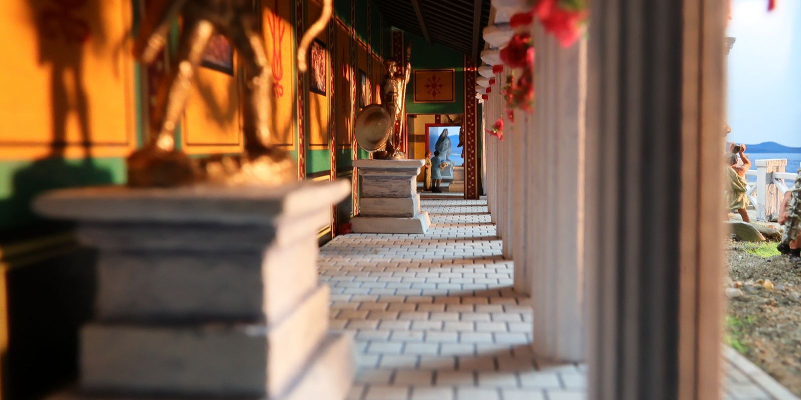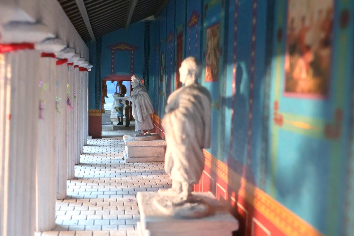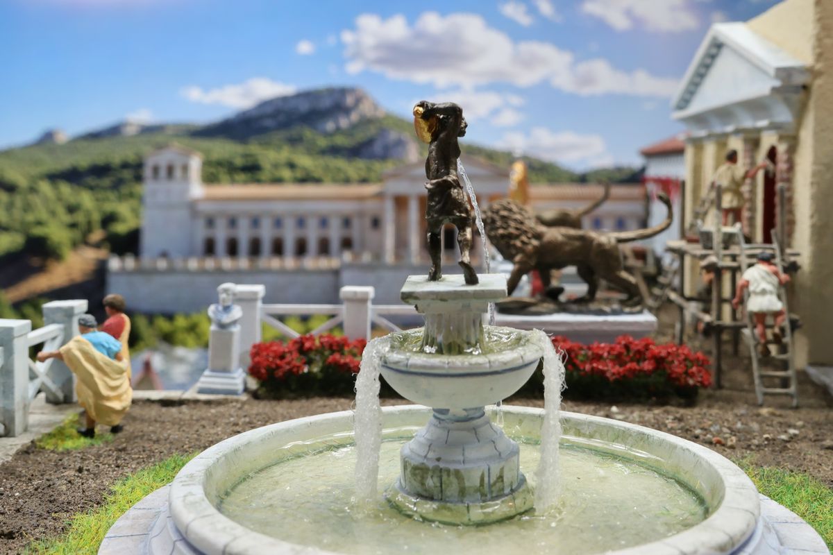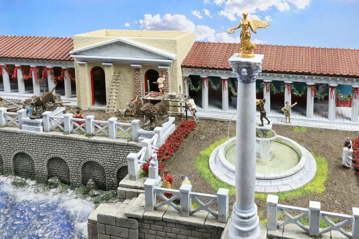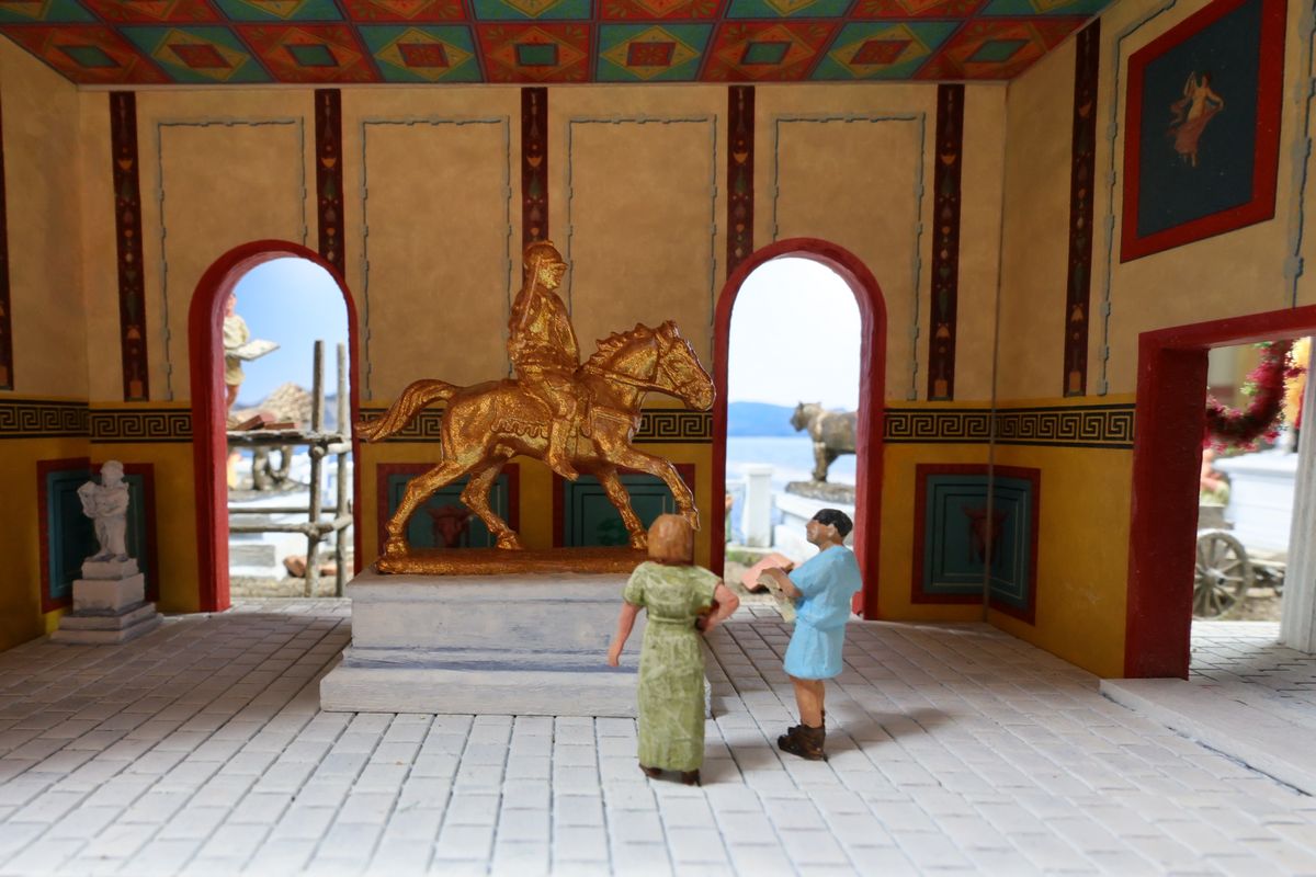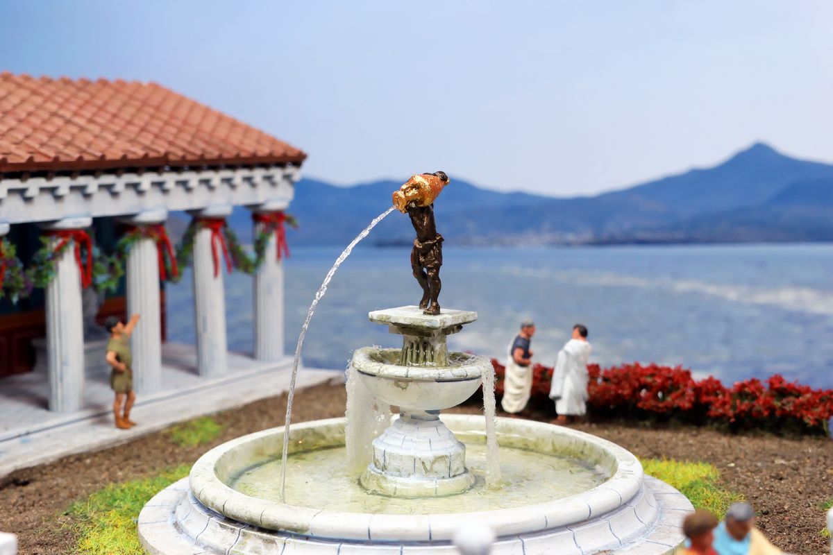 DIE THERMEN Dies ist das erste Diorama in der Kollektion, das einen Innenraum zeigt, mit anderen Worten: eine Puppenstube. Zu sehen ist ein Ausschnitt einer luxuriösen Thermenanlage der hohen Kaiserzeit. Das große Schwimmbecken nannten die Römer piscina, zu deutsch Fischteich. Fische tummeln sich hier zwar nicht im Wasser, aber die Gestaltung einer realistisch wirkenden Wasserfläche war auch so mit die wichtigste Herausforderung bei diesem Projekt. |