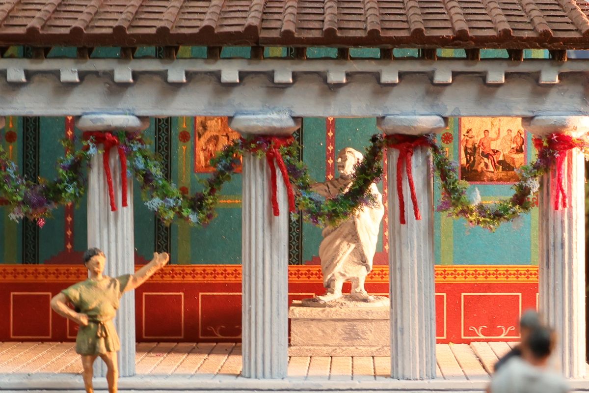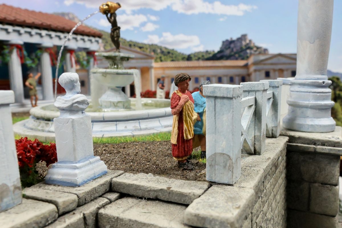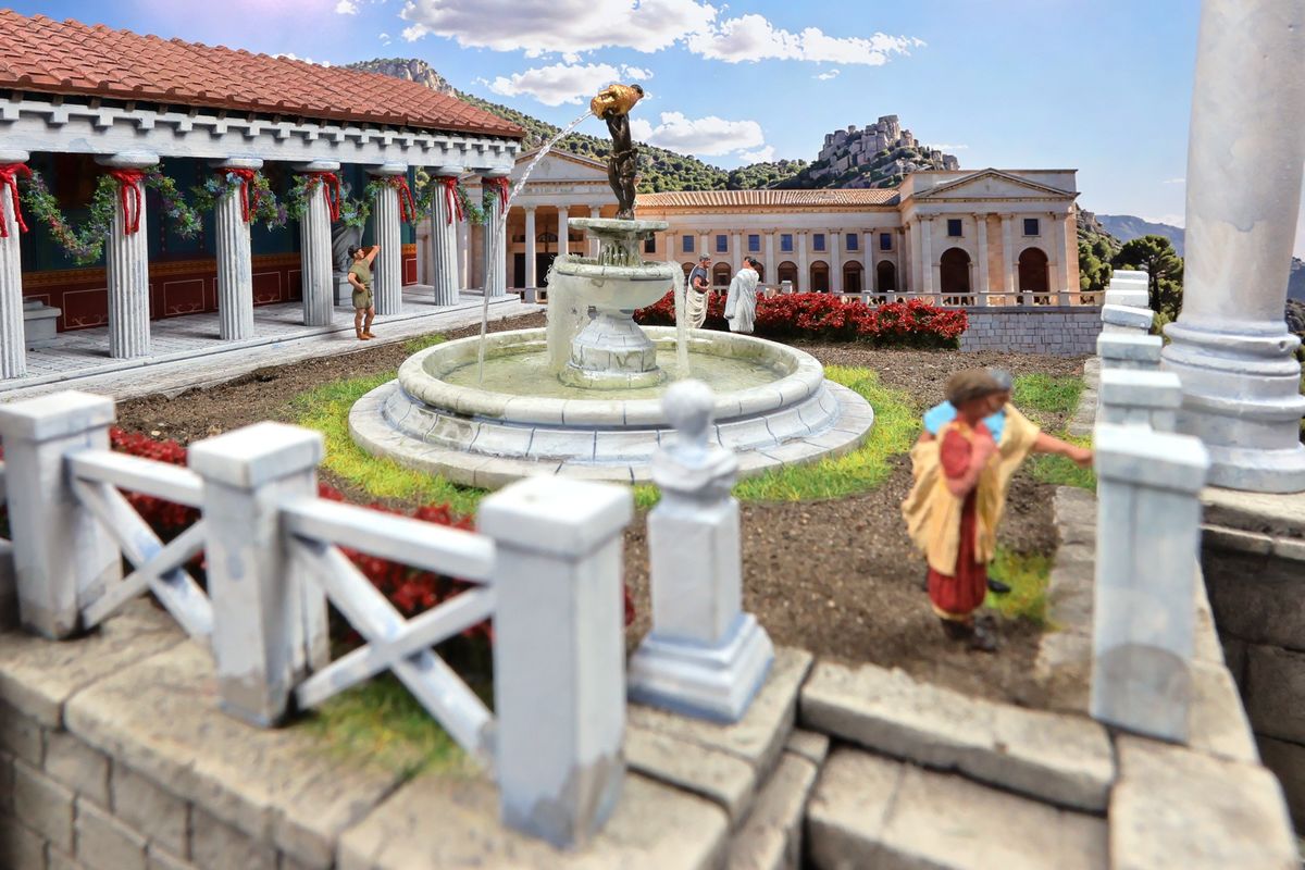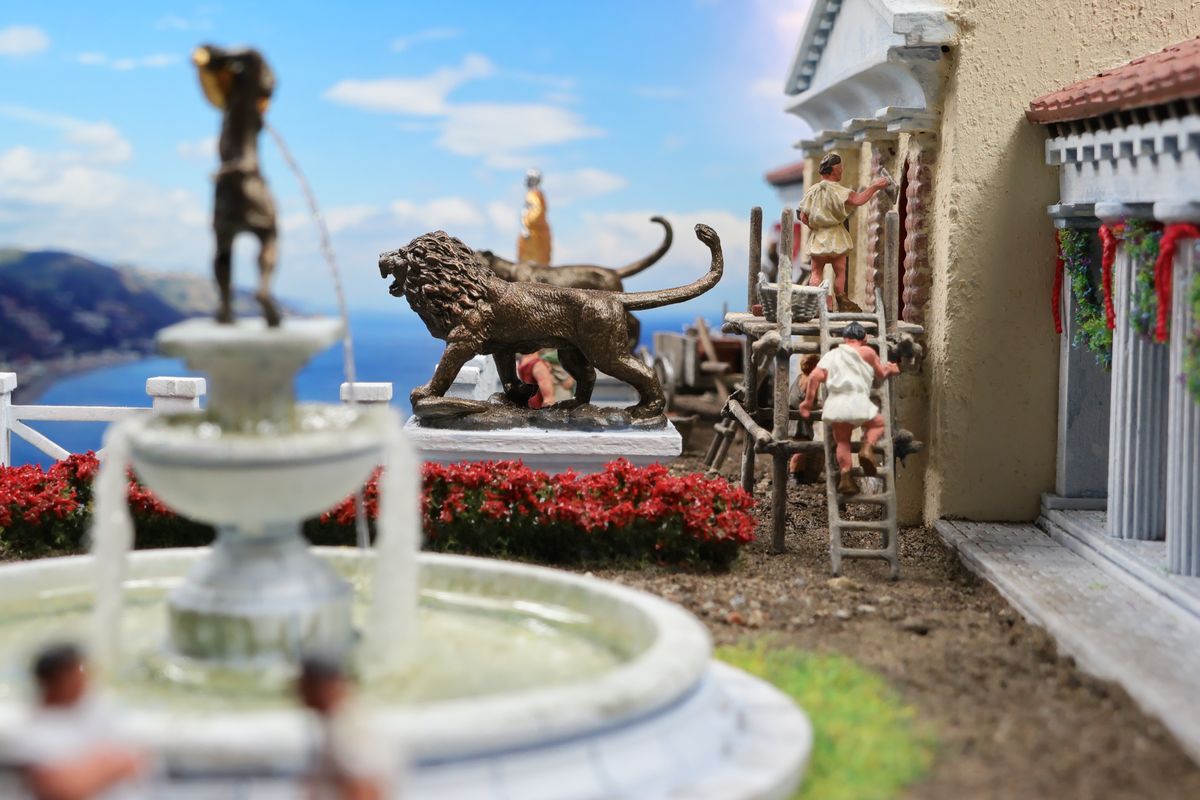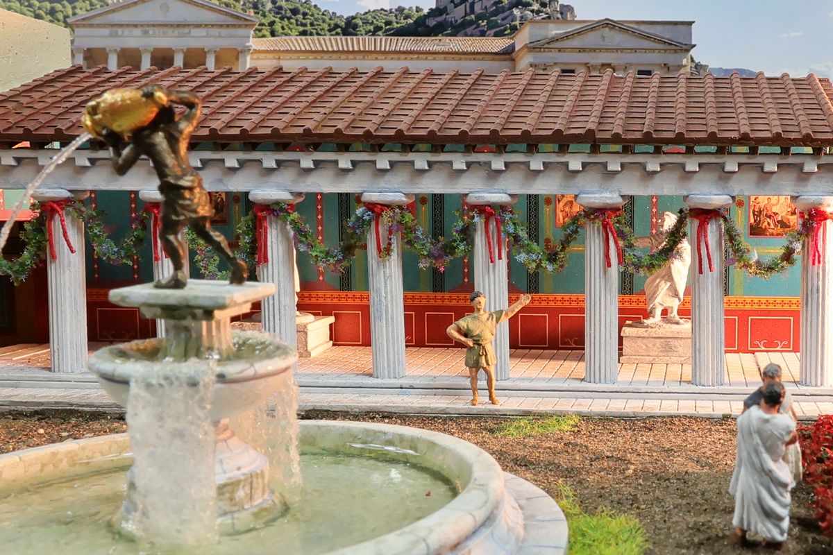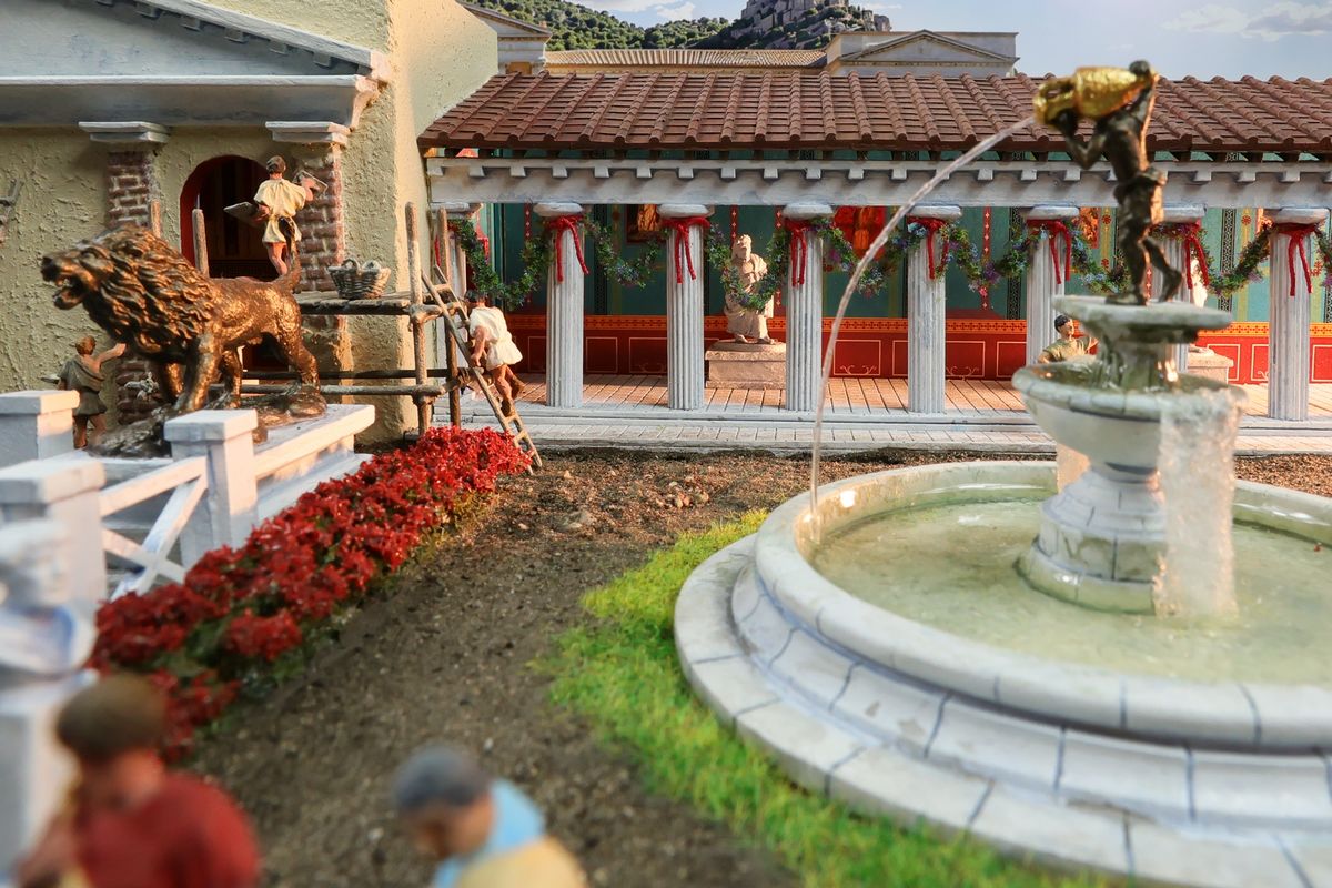 DIE GARTENPARTY Eine Gartenparty mit Musik und Tanz, überaus kultivierten Gesprächen und natürlich reichlich Essen und Trinken, dargereicht ausschließlich mit edlem Silbergeschirr… Das abendliche Gastmahl (lat. cena oder convivium) war gewissermaßen das Herz des gesellschaftlichen Lebens im Alten Rom. Dieses Diorama zeigt einen Garten, der über ein sogenanntes Sommertriclinium verfügt. Triclinium kann dabei zum einen das Esszimmer bezeichnen, in dem die kanonische Zahl von drei Speisesofas untergebracht ist, aber auch – wie hier – eine gemauerte Speiseliege im Garten, angenehm beschattet durch eine Pergola. Reale Vorbilder existieren zum Beispiel in Pompei. Das Diorama wurde in verschiedenen Serien mit jeweils unterschiedlichem Bildhintergrund photographiert, was zu ganz reizvollen Unterschieden in der Wirkung führt. Dabei gibt es schon ein Garten-Diorama, und eigentlich sollen sich die Themen nicht wiederholen. Aber die ältere Arbeit soll einen Eindruck von einer kaiserlichen Villa geben und ist deshalb recht weitläufig, während hier ein intimerer Garten der „Mittelschicht“ dargestellt ist. Römische Gärten waren geometrisch angelegt, gegliedert durch Hecken und niedrige Zäune und Mauern. Auch Wasserbecken in geometrischen Formen gehörten dazu, sie waren dekorativ, sorgten aber auch für Abkühlung. Allerdings wurde die Liebe zur Geometrie noch nicht zu solchen Extremen getrieben, wie man sie später etwa von französischen Barockgärten kennt, und es gab auch kritische Stimmen über „Perversionen“ und „Exzesse“ wie etwa die Zucht von Zwergformen bei manchen Pflanzen. Dieser Garten zeigt deshalb einen Mix aus strenger Ordnung und Wildwuchs; das Ideal einer üppig und (scheinbar) ungehindert wuchernden Vegetation wird zum Beispiel auch auf römischen Wandbildern präsentiert. Die cena beginnt üblicherweise am Nachmittag und kann bis zum Sonnenuntergang dauern – oder auch darüber hinaus… Dementsprechend gibt es auch eine Bilderserie mit einem Hintergrund bei Dämmerung (das Photo wurde auch schon beim Tanz der Salier verwendet; © Giorgio Galeotti, CC BY 4.0): |