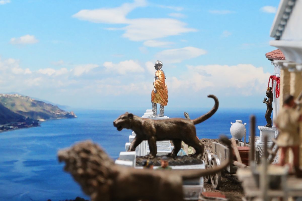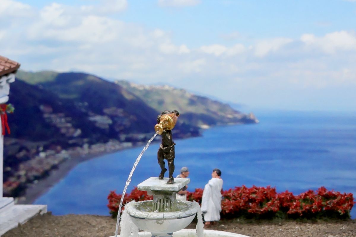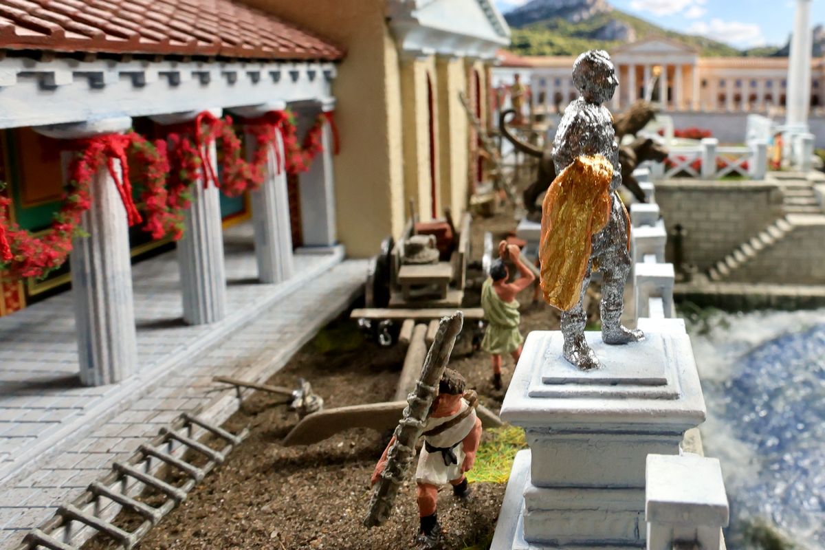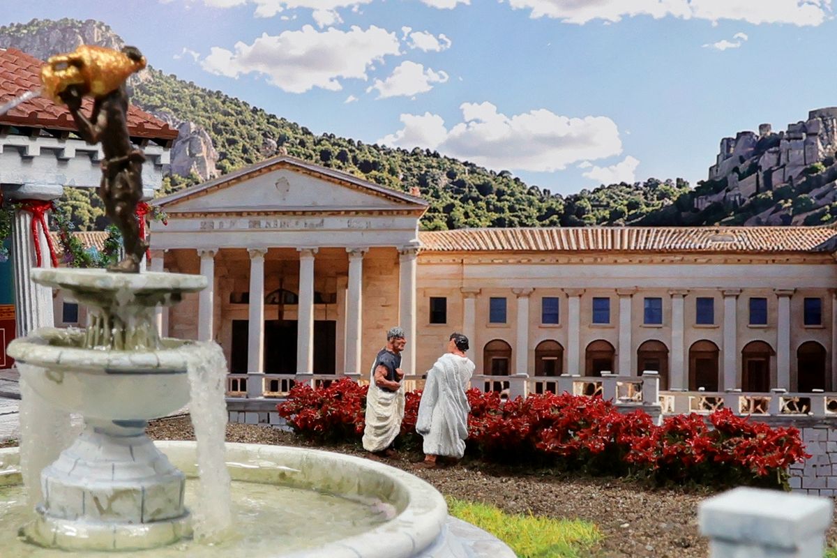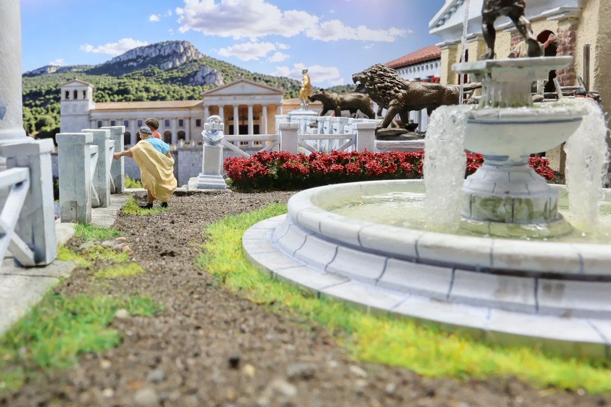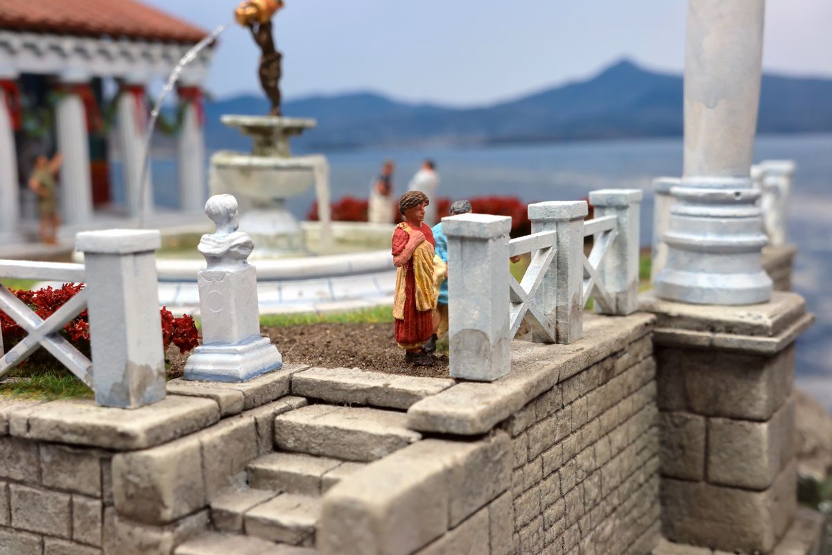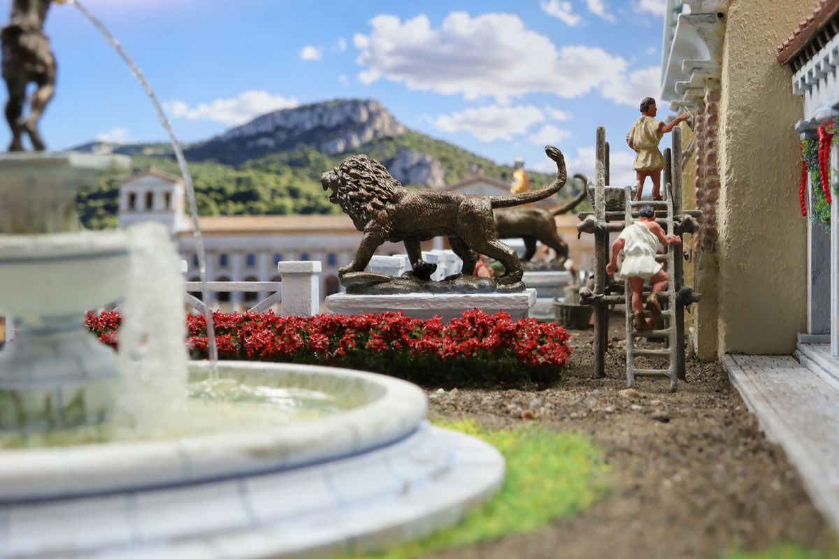 DIE GARTENPARTY Eine Gartenparty mit Musik und Tanz, überaus kultivierten Gesprächen und natürlich reichlich Essen und Trinken, dargereicht ausschließlich mit edlem Silbergeschirr… Das abendliche Gastmahl (lat. cena oder convivium) war gewissermaßen das Herz des gesellschaftlichen Lebens im Alten Rom. Dieses Diorama zeigt einen Garten, der über ein sogenanntes Sommertriclinium verfügt. Triclinium kann dabei zum einen das Esszimmer bezeichnen, in dem die kanonische Zahl von drei Speisesofas untergebracht ist, aber auch – wie hier – eine gemauerte Speiseliege im Garten, angenehm beschattet durch eine Pergola. Reale Vorbilder existieren zum Beispiel in Pompei. Das Diorama wurde in verschiedenen Serien mit jeweils unterschiedlichem Bildhintergrund photographiert, was zu ganz reizvollen Unterschieden in der Wirkung führt. Dabei gibt es schon ein Garten-Diorama, und eigentlich sollen sich die Themen nicht wiederholen. Aber die ältere Arbeit soll einen Eindruck von einer kaiserlichen Villa geben und ist deshalb recht weitläufig, während hier ein intimerer Garten der „Mittelschicht“ dargestellt ist. Römische Gärten waren geometrisch angelegt, gegliedert durch Hecken und niedrige Zäune und Mauern. Auch Wasserbecken in geometrischen Formen gehörten dazu, sie waren dekorativ, sorgten aber auch für Abkühlung. Allerdings wurde die Liebe zur Geometrie noch nicht zu solchen Extremen getrieben, wie man sie später etwa von französischen Barockgärten kennt, und es gab auch kritische Stimmen über „Perversionen“ und „Exzesse“ wie etwa die Zucht von Zwergformen bei manchen Pflanzen. Dieser Garten zeigt deshalb einen Mix aus strenger Ordnung und Wildwuchs; das Ideal einer üppig und (scheinbar) ungehindert wuchernden Vegetation wird zum Beispiel auch auf römischen Wandbildern präsentiert. Die cena beginnt üblicherweise am Nachmittag und kann bis zum Sonnenuntergang dauern – oder auch darüber hinaus… Dementsprechend gibt es auch eine Bilderserie mit einem Hintergrund bei Dämmerung (das Photo wurde auch schon beim Tanz der Salier verwendet; © Giorgio Galeotti, CC BY 4.0): |
