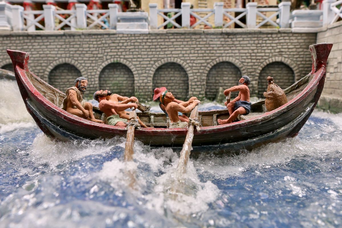 PONTON-TRAINING Eine Szene irgendwo in Germania Inferior in der Spätantike: Römische Soldaten beim Üben mit einer Schwimmbrücke. Das Gewässer, an dem das Ganze stattfindet, ist ein kleines Flüsschen und nicht der majestätische Rhenus – was sicher von Vorteil ist, wenn man sieht, wie offensichtlich noch dringend geübt werden muss. |